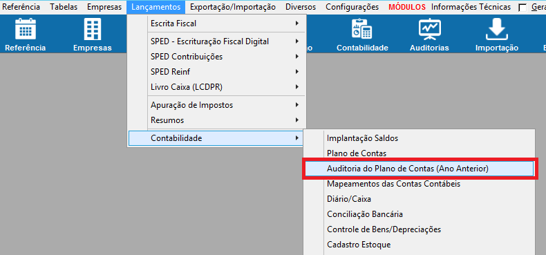 A opção Auditoria do Plano de Contas (Ano Anterior) deve ser utilizada para atualizar a Numeração das Contas de Fornecedor/Cliente quando ocorre a troca de um ano para o outro e em virtude disso erros na Validação do SPED Contábil/ ECF.