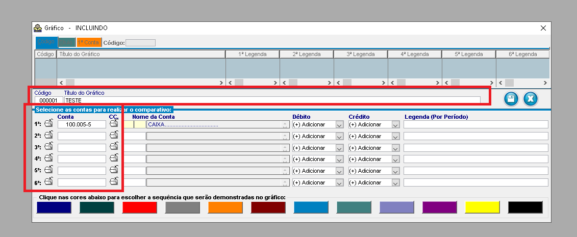 2 - Clique no botão incluir, na parte superior da tela e informe o código, título e as contas que deverão ser demonstradas no gráfico e salve;