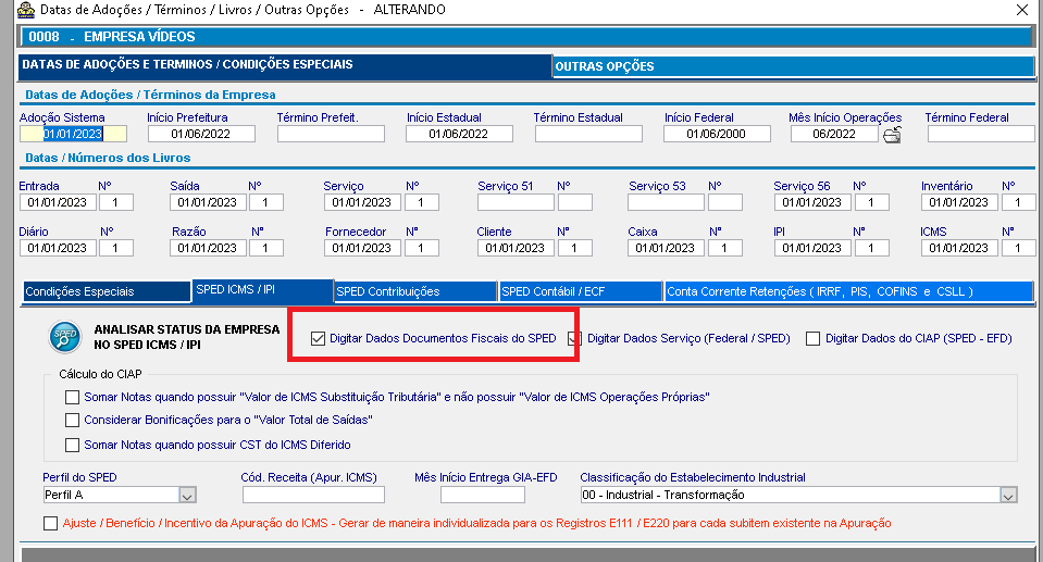 2- Acesse a opção Datas/Livros, na palheta Sped ICMS/IPI, peço que assinale o campo Digitar dados documentos fiscais do Sped