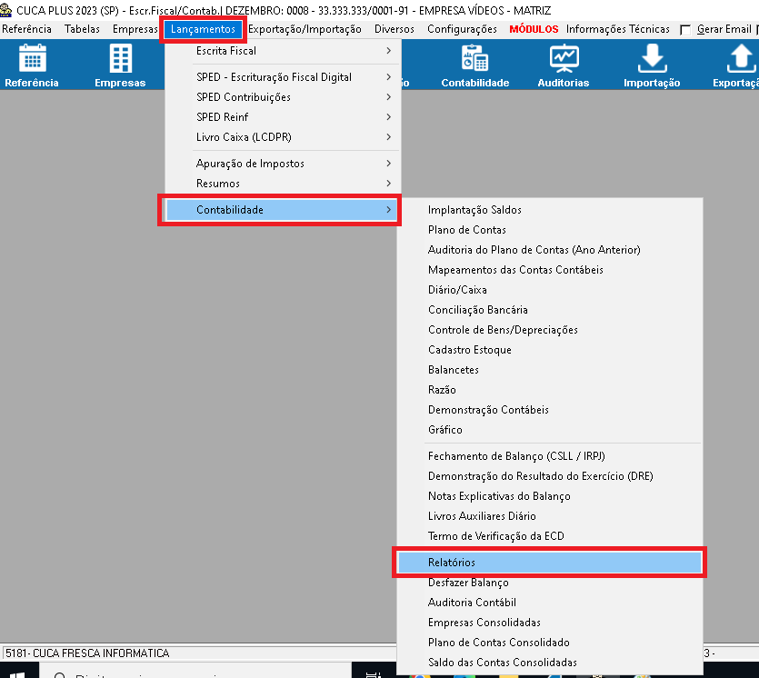 1 - Acesse "Lançamentos" => "Contabilidade" => "Relatórios";