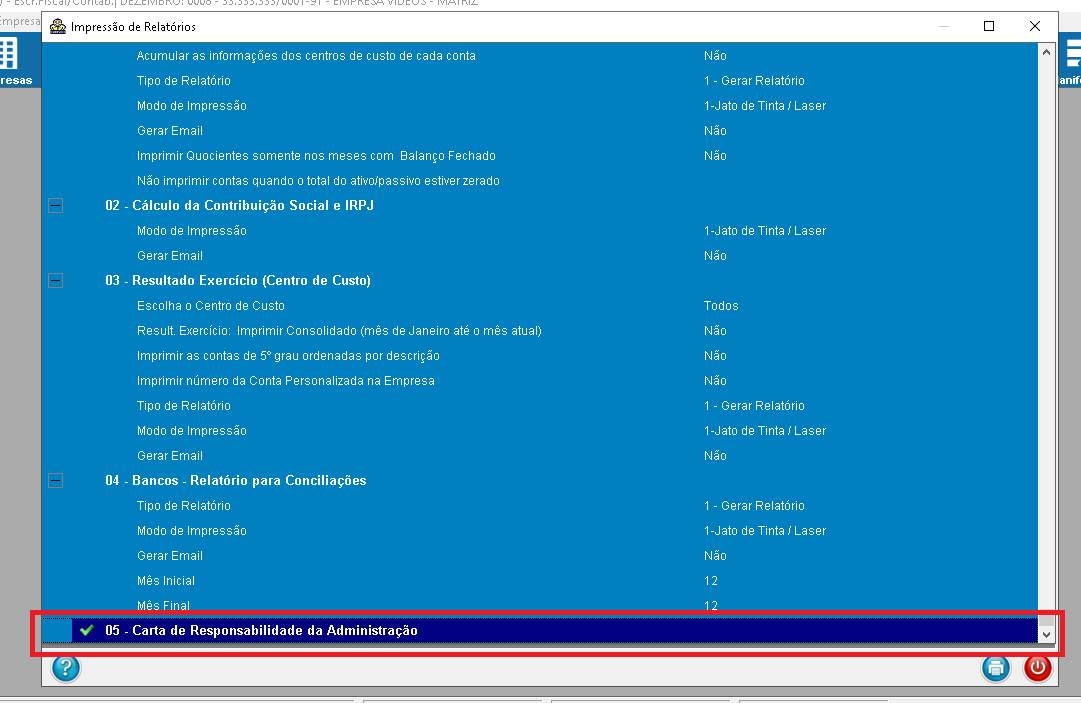 2 - Clique na opção 5 - Carta de Responsabilidade da Administração, clique na impressora;