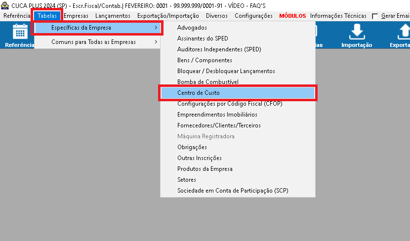 1 - Acesse a opção "Tabelas" => "Específicas da Empresa" => "Centro de Custo";