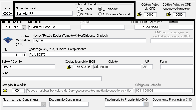 3- O campo referente ao Código de pagamento da GPS, apenas deve ser preenchido para Obra, que se refere a um local externo, caso utilize o Loca para envio ao SEFIP. Portanto, caso não utilize mais, poderá deixar em branco;
