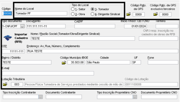 2- Informe a opção 3-Tomador no quadro Tipo de Local.