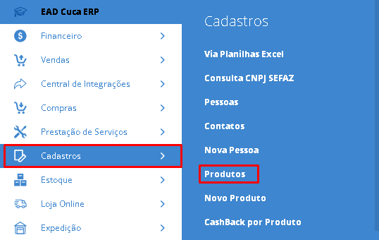 Para definir o peso dos produtos, acesse o menu lateral Cadastros, submenu Produtos, e edite o produto. Caso deseje adicionar um produto, clique em Novo no topo da tela.