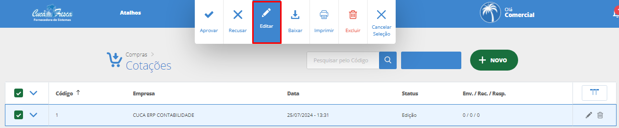 Para isso deve-se acessar o menu lateral Compras, submenu Cotações.