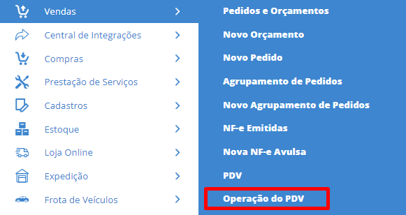 Para isso acesse o menu lateral Vendas, submenu Operações PDV.