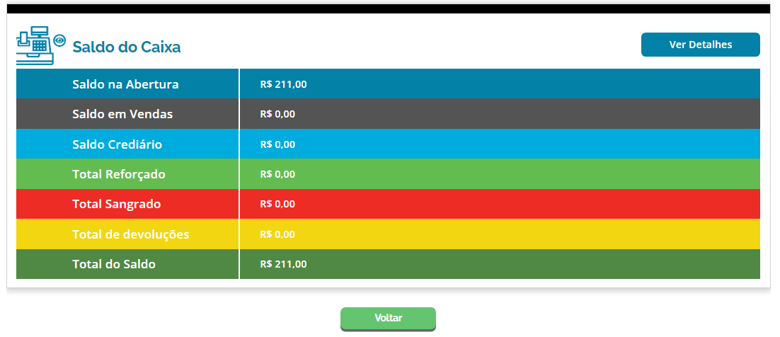Clicando sobre esta opção, o sistema disponibilizará os valores de cada operação do seu caixa: