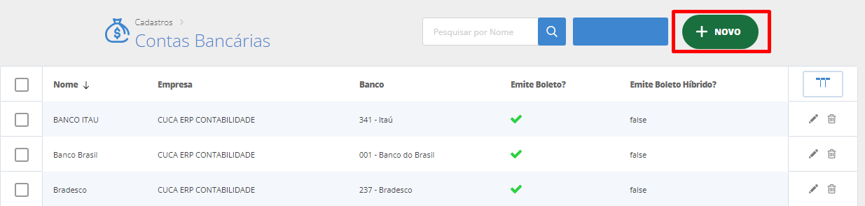Em seguida, clique em Novo, ou Edite a conta bancária já existente.
