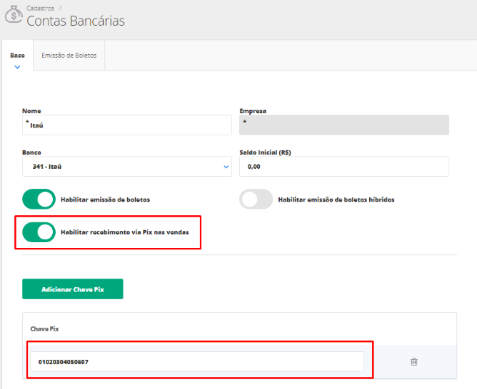 Agora, na tela de cadastro da Conta Bancária, preencha os dados necessários e selecione a opção Habilitar recebimento via Pix nas vendas e informe a Chave Pix correspondente.