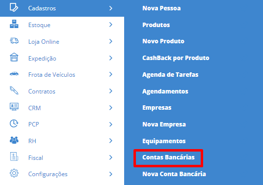 Primeiramente, será necessário cadastrar a conta bancária acessando o menu lateral Cadastros, submenu Contas Bancárias.