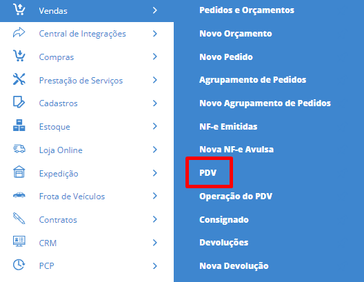 Para isso, acesse o menu lateral Vendas, submenu PDV.