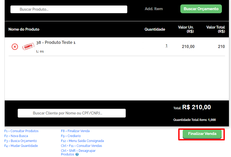 No PDV, preencha as informações de Produtos vendidos e Cliente, caso desejar. Em seguida, clique em Finalizar Venda.