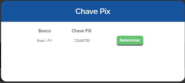A seguir, será aberta uma tela para selecionar qual chave Pix deseja utilizar nesta venda. É possível que você tenha várias chaves Pix cadastradas em diferentes contas bancárias, portanto o sistema informa na tela a chave e o banco correspondente à ela, dessa forma você poderá Selecionar a que desejar: