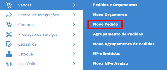 Para isso, acesse o menu lateral Vendas, submenu Novo Pedido.