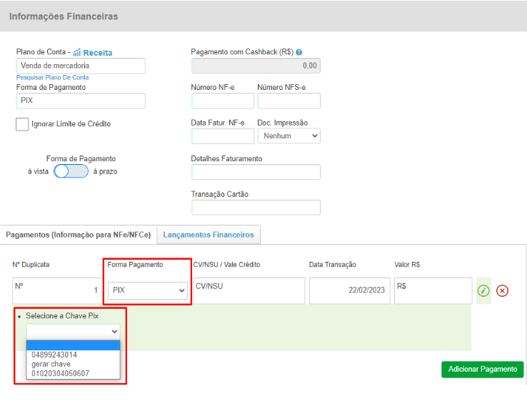 Feito isso, acesse a seção Informações Financeiras. Neste momento clique em Adicionar Pagamento e no campo Forma Pagamento informe a opção Pix. Em seguida, expanda o pagamento no ícone de lápis e selecione a chave que deseja utilizar. Assim que selecionar a chave, o sistema informa qual o banco correspondente à ela.