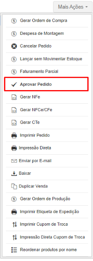 Por fim, você poderá Salvar sua venda, clicar em Mais Ações e selecionar a opção Aprovar Pedido, para que seja gerado o lançamento financeiro.
