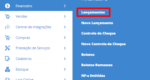 Para visualizar como ficou essa informação junto ao financeiro, acesse menu lateral Financeiro e em seguida Lançamentos: