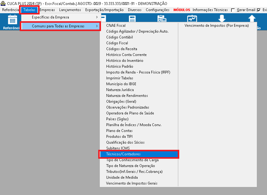 1 - Acesse a opção "Tabelas" => "Comuns para todas as empresas" => "Técnicos/Contadores";