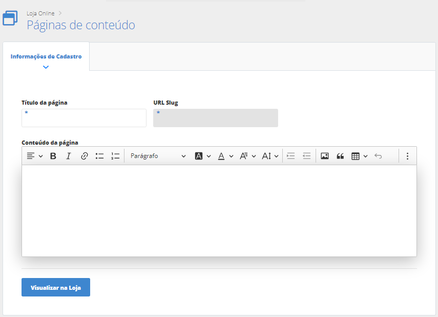 Na Loja Online, você pode criar quantas páginas desejar. E o caminho é bem simples, acesse o menu lateral Loja Online, submenu Páginas e em seguida, clique em Novo.