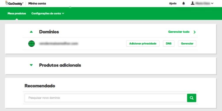 1. Acesse sua conta GoDaddy e clique em Meus Produtos, na seção Domínios, selecione o domínio desejado e clique em DNS.