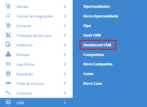 Com o Dashboard CRM é possível fazer toda a gestão das oportunidades criadas no dia a dia da sua empresa. Para conhecer os recursos deste módulo, acesse o menu lateral CRM, submenu Dashboard CRM e você será direcionado para o Painel de Controle do CRM.
