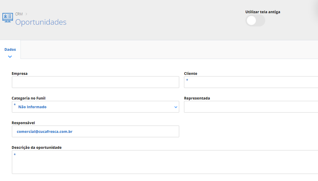 A seguir, na tela de Cadastro de Oportunidades preencha as informações: