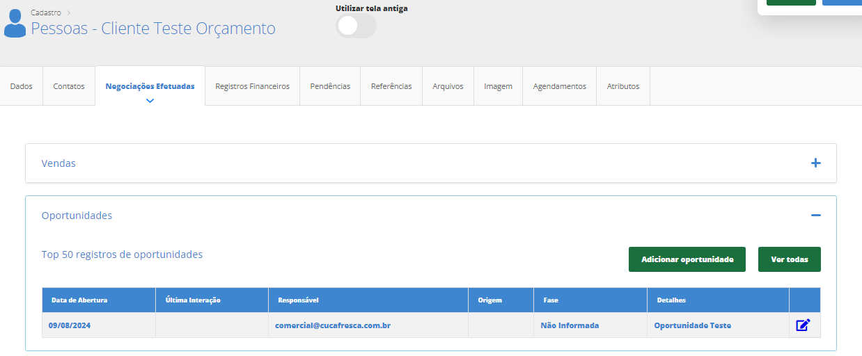 Ainda, você poderá visualizar as oportunidades vinculadas a um cliente, dentro do cadastro dele no sistema. Para isto, acesse menu lateral Cadastros, submenu Pessoas e clique no ícone de lápis para Editar o cadastro do cliente desejado.