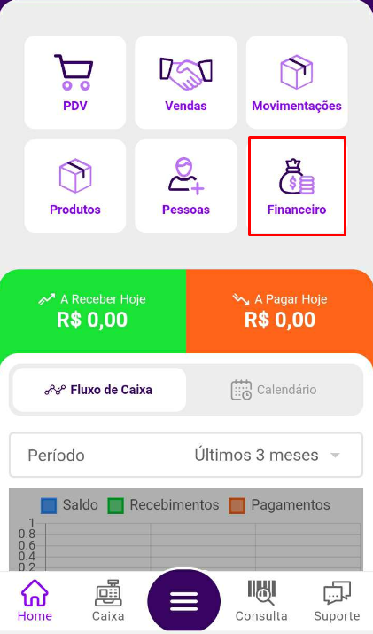 Além de utilizar o aplicativo do celular para registrar vendas, você também pode acompanhar e criar novos lançamentos financeiros.