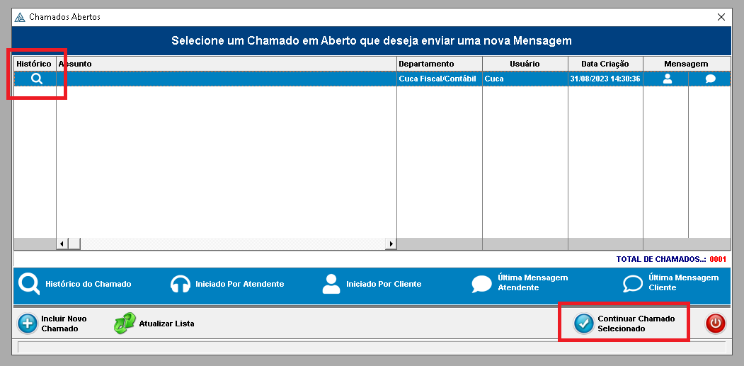 5- Caso deseje dar continuidade no chamado, clique em "Continuar Chamado Selecionado";