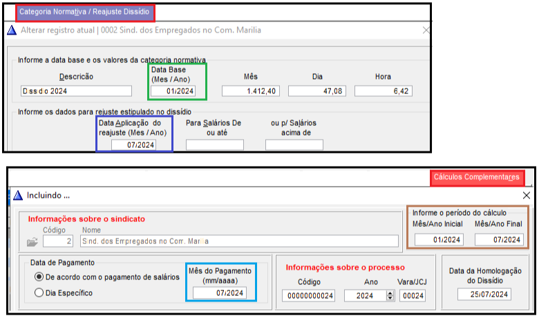 Para o Cálculo Complementar, foi informado no "Período do Cálculo" as datas de 01/2024 a 07/2024, veja que este período está dentro da data base e a data da aplicação do Reajuste e que todos os cálculos que ocorreram entre Janeiro e Julho de 2024 com o Salário antigo, serão complementados e isto inclui Folha Mensal, Férias e Rescisão, o Mensal de Julho não será complementado, apesar do período final do complementar ser 07/2024, a aplicação do Reajuste se deu no próprio mês de Julho e isto significa que a Folha já será fechada com o salário novo. Se ocorreram Férias ou Rescisões antes do Reajuste ser aplicado no mês 07, os mesmos serão complementados normalmente.
