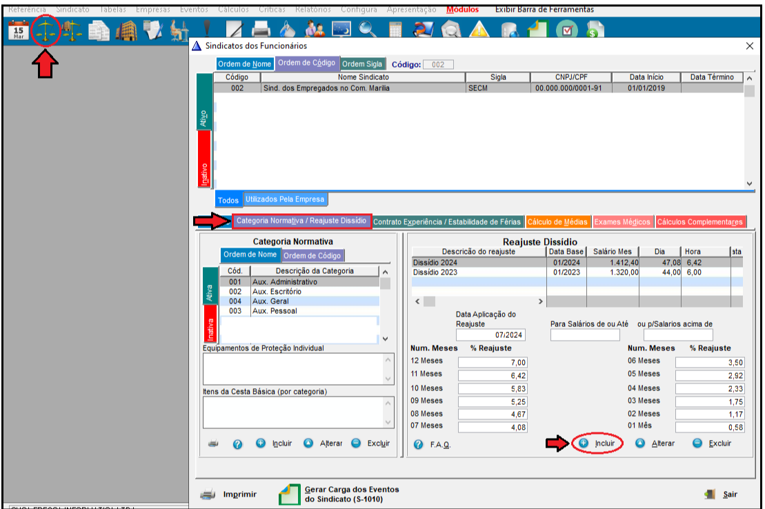 1- Acesse a tela de Sindicatos => selecione o sindicato => "Categoria Normativa / Reajuste Dissídio", selecione a Categoria e na tela ao lado direito clique em "Incluir";