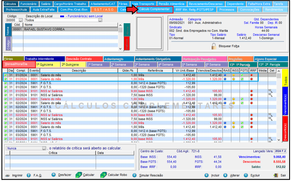 1- Acesse a tela de "Cálculos" => "Eventos Funcionários" => "Cálculos Complementares" e selecione a pasta "Mensal/Hora/Dia/Professor/Tarefa";