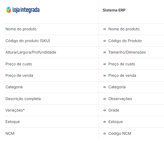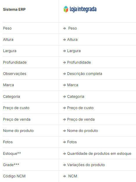 Produtos – Campos importados: Loja Integrada => Sistema ERP