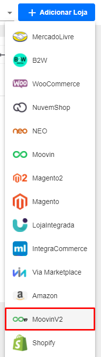 Na nova tela, clique em Adicionar Loja, selecione a opção Moovin V2.