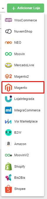 Agora, em Adicionar Loja, selecione a opção Magento.