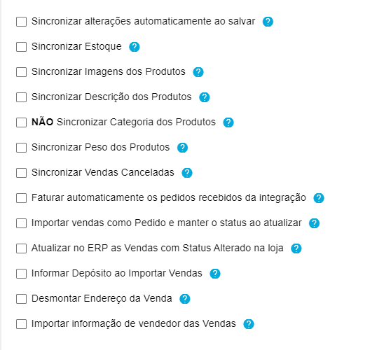 Logo abaixo terão mais configurações, as quais você poderá marcar caso necessário. Para verificar a descrição de cada uma delas, clique no ícone "?" em com azul ao lado.