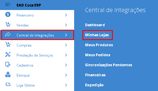 Com todas as informações geradas, você deverá acessar ERP, em seguida, o menu lateral Central de Integrações, submenu Minhas Lojas.