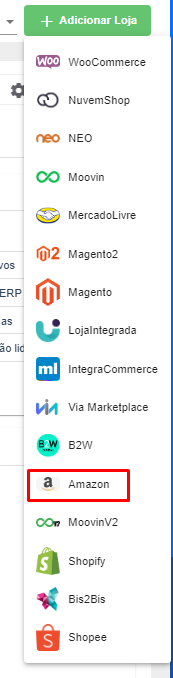 Em seguida, clique na opção Adicionar Loja, e selecione a opção Amazon.