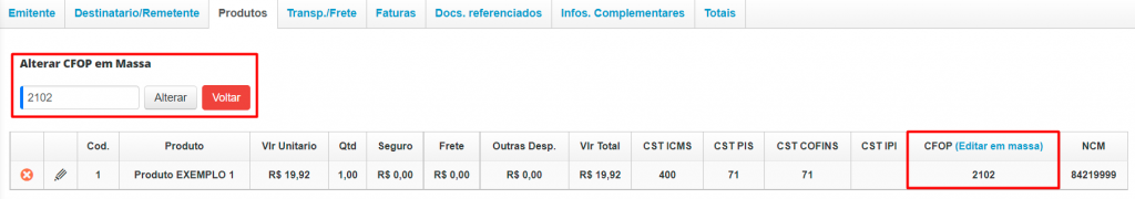 Porém, caso a NF-e seja uma entrada, deixe a opção Entrada informada no campo Tipo de Operação, e altere o CFOP dos seus produtos. Para isso, na edição da NF-e, acesse a aba Produtos e no campo CFOP (Editar em massa), informe o CFOP correspondente à entrada.