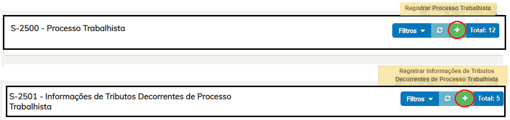 Feito isso, poderá clicar nas opções necessárias S-2500 e/ou S-2501 para então realizar as inclusões necessárias dos dados do processo para declaração destas cargas ao eSocial (Para tal clique em inserir sinal de +) .