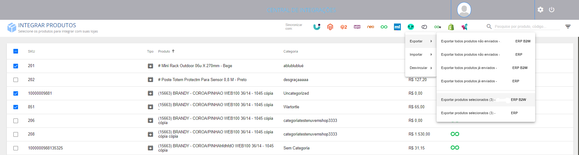 Exportar produtos do ERP para a B2W