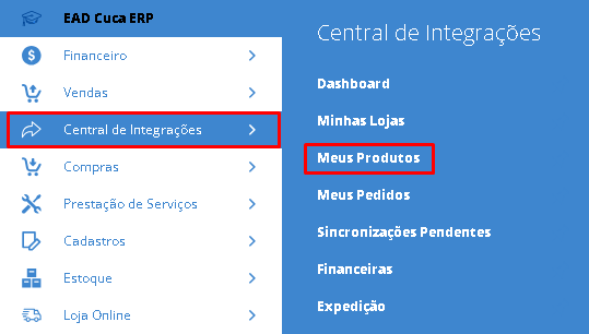 Na primeira delas, acesse o menu lateral Central de Integrações, submenu Meus Produtos.