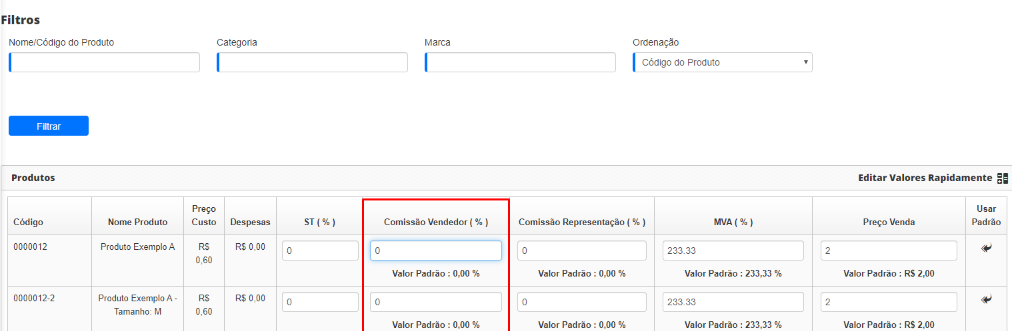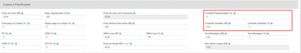 Comissão Vendedor (%): Neste campo, informe um percentual a ser calculado sobre o preço de venda deste produto;