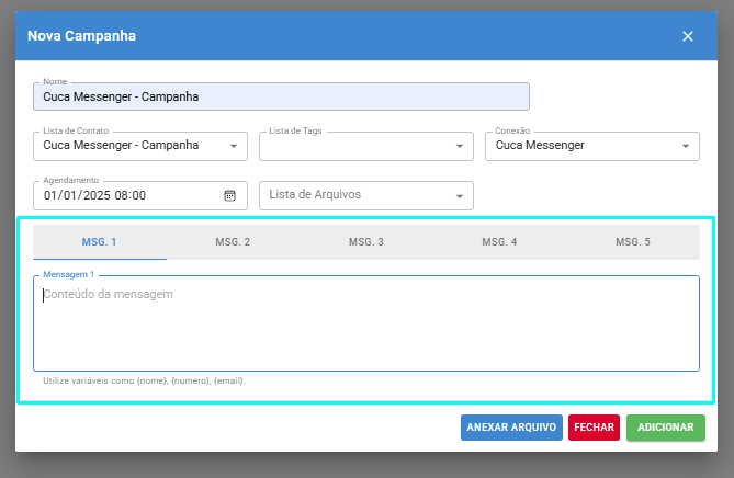 Importante! Perceba que é possível escrever diferentes tipos de mensagens, que serão enviadas de acordo com o período definido anteriormente pelo "Intervalo Randômico de Disparo".