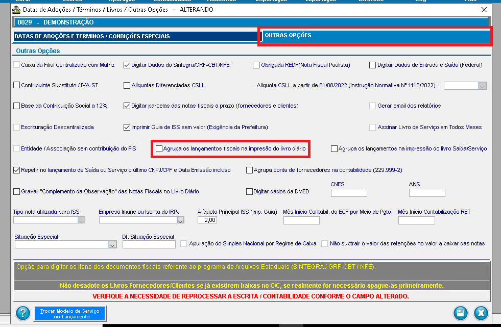 2 - Selecione a palheta "Outras opções" e marque o campo "Agrupa lançamentos fiscais na impressão do livro diário" e salve.