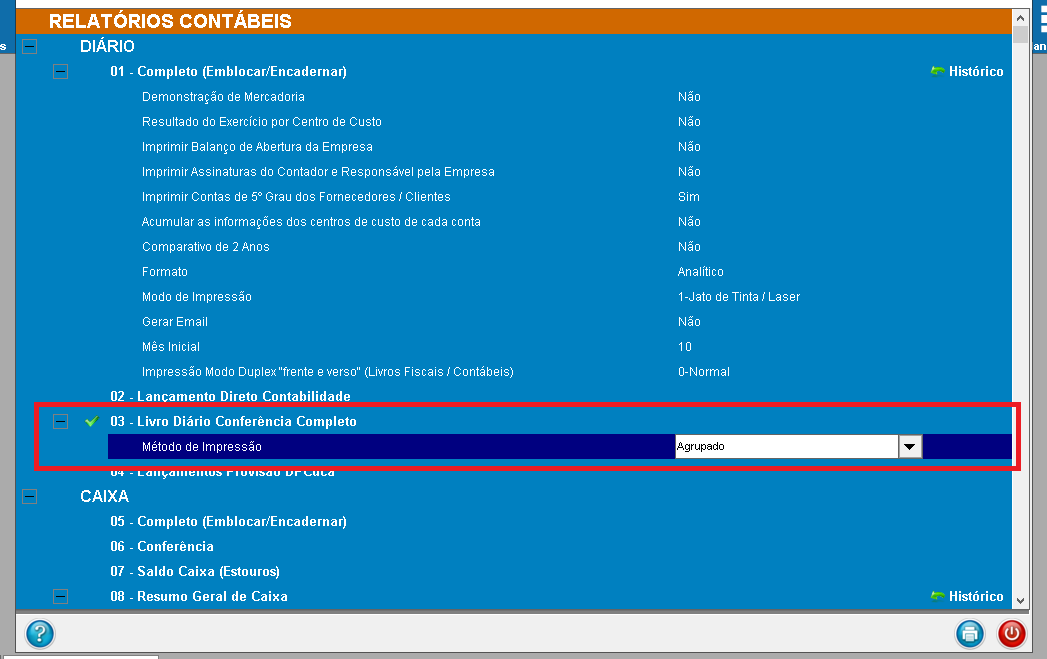 2 - Clique na impressora, marque a opção "Livro Diário Conferência Completo" e na linha "Método de impressão", selecione "Agrupado" e confirme.