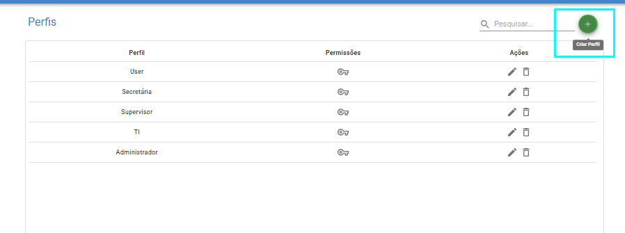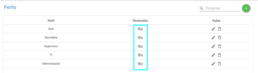 No ícone de "chave", é onde será realizado as permissões e as liberações que esse Perfil terá.