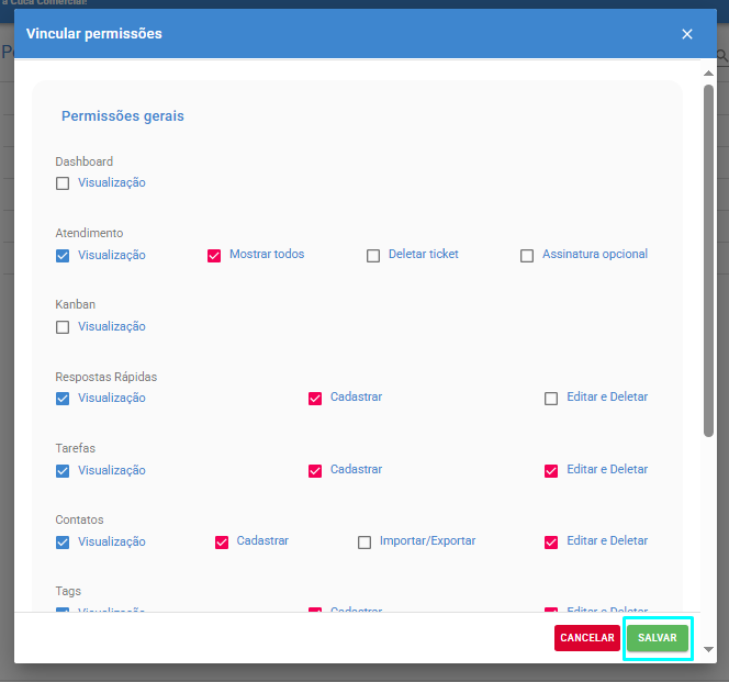 Realizada as permissões no Perfil, apenas clicar em "Salvar".