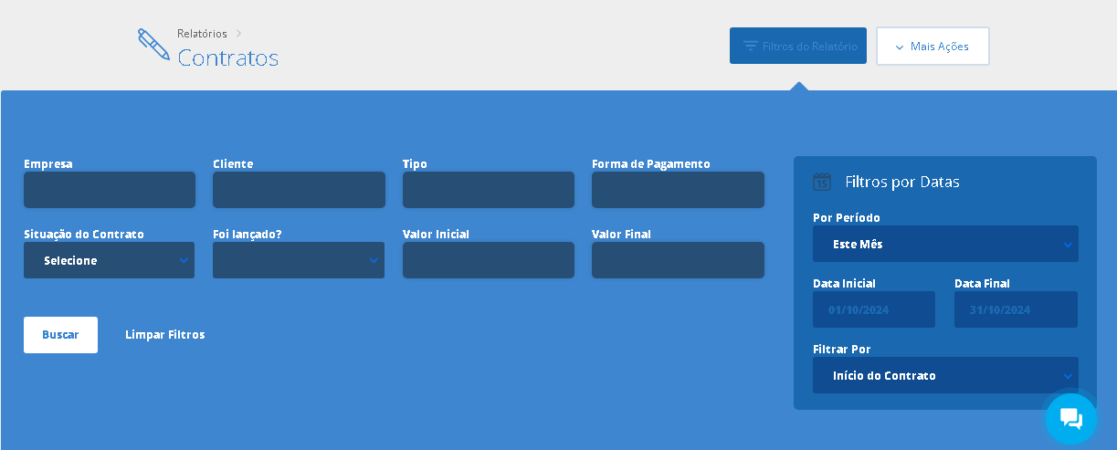 Este relatório mostrará uma listagem de todos os contratos cadastrados no sistema. Você poderá verificar informações importantes sobre os contratos, como datas de início e término, se foram lançados no financeiro, entre outros dados.